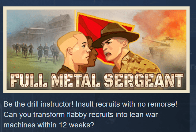 Another great example of “Full Metal Sergeant” on the short description and stating the game promise.