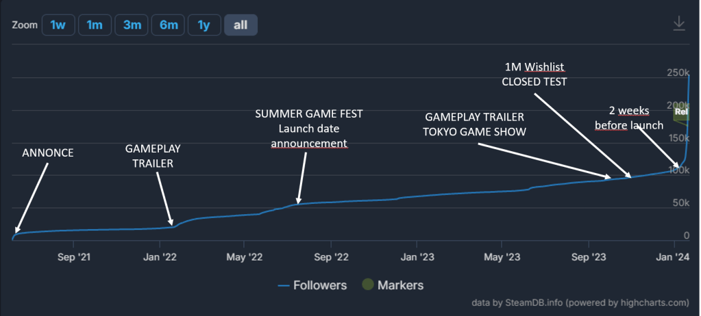 We also see the strength of having a previous game and studio to gather a significant amount of wishlist (I estimate at 100k WL on the first week – based on their ratio when they announced the 1M wishlist).